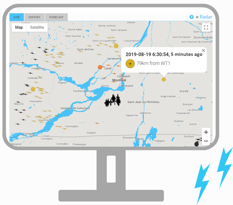 • Distinction between cloud-to-cloud and cloud-to-ground lightning in real time